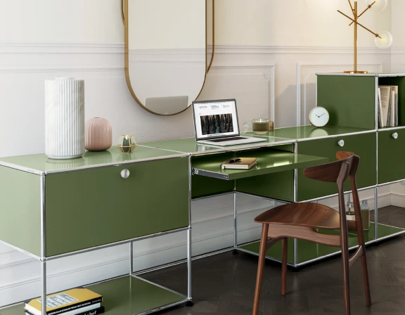 Ein neuer Farbton gesellt sich zu den Standardfarben des Designklassikers USM Haller. Das bedeutet, dass du dir bei uns jedes USM Möbel nach deinen Wünschen in Olivgrün bestellen kannst.